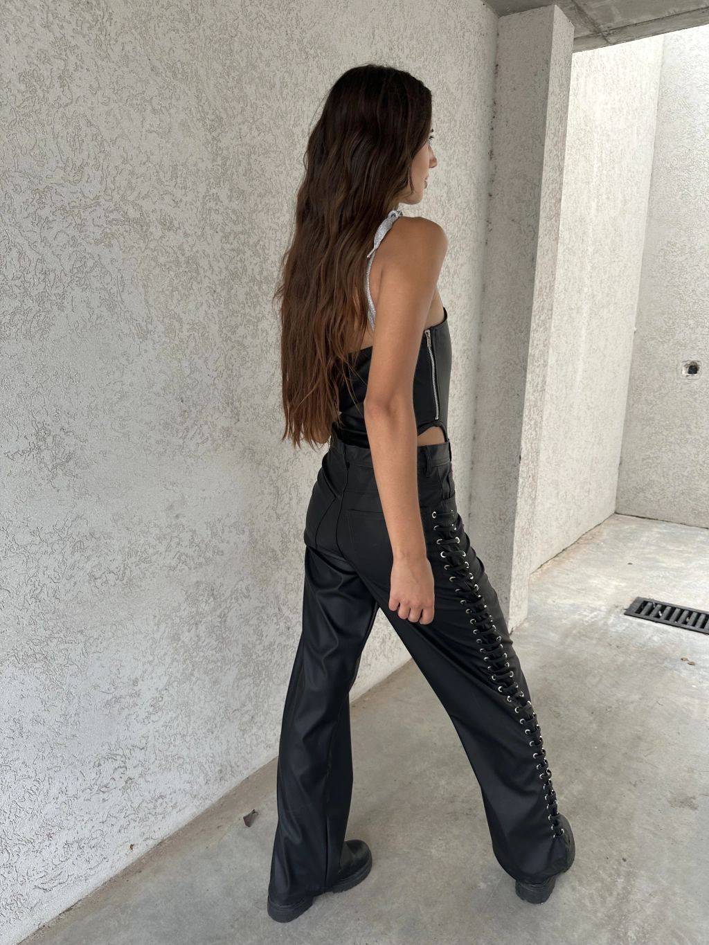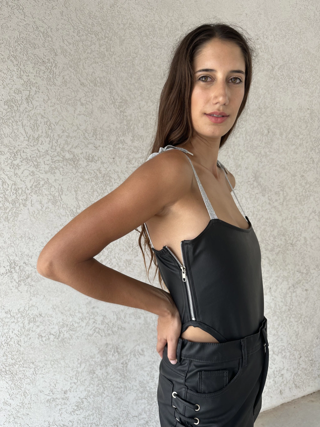 Este body confeccionado en ecocuero presenta un diseño moderno y versátil. Con cierres en sus laterales, permite una fácil adaptación a tu figura. Las tiras regulables de lurex añaden un toque de brillo, mientras que los ganchos estilo corpiño en la parte inferior te permitirán ajustar el tiro a tu medida. Ideal para combinar con tus prendas favoritas, este body es una opción imprescindible para quienes buscan estilo y comodidad.