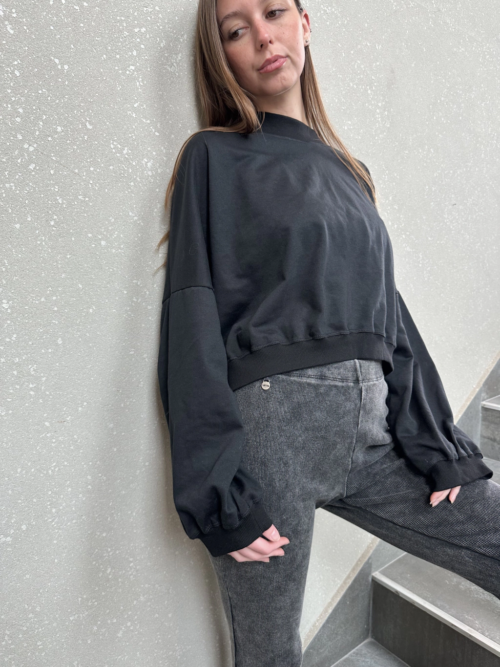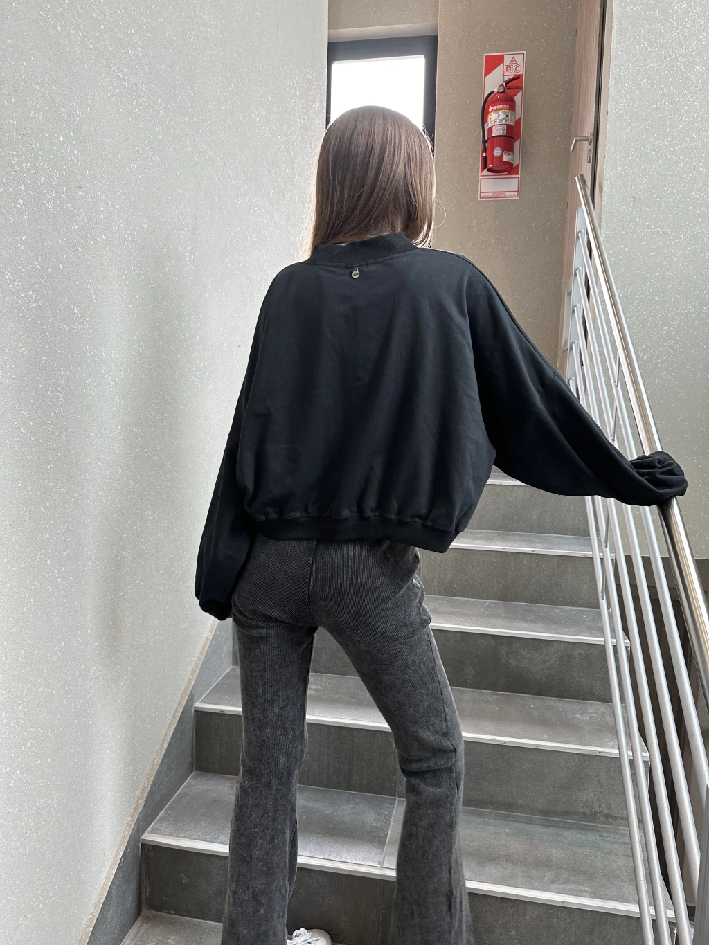 Buzo de algodón gamuzado en un sofisticado tono negro. Este modelo oversize ofrece un corte a la cadera, perfecto para un look relajado y moderno. Los detalles de ribb a tono añaden un toque distintivo y elegante, garantizando comodidad en todo momento.