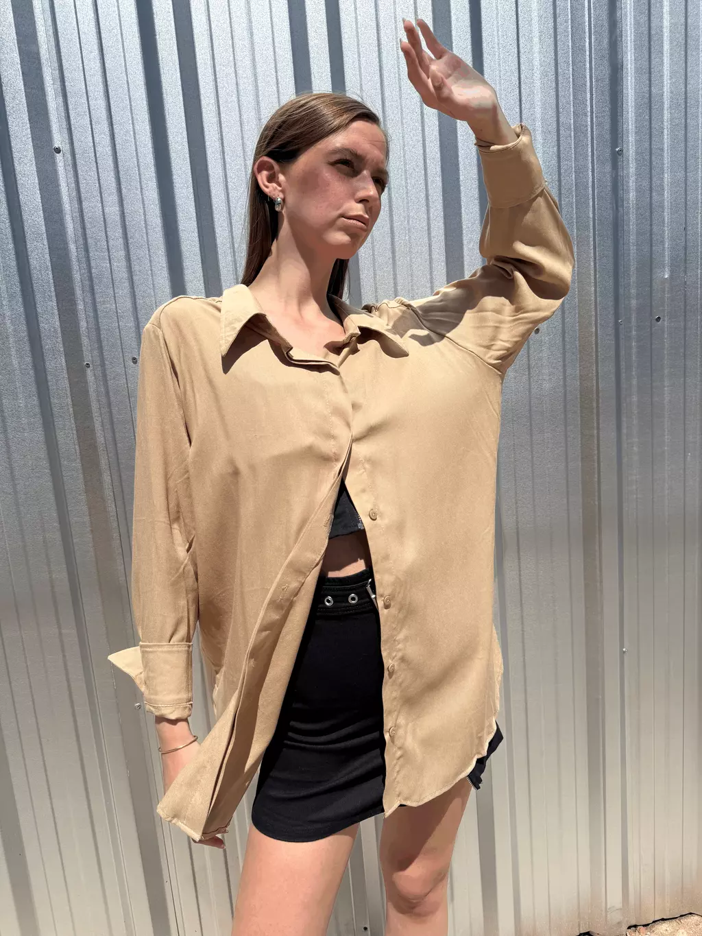 La camisa oversize con puños irregulares está elaborada en rayon twill, un material suave y cómodo. Este diseño único ofrece un estilo moderno y versátil, perfecto para cualquier ocasión.