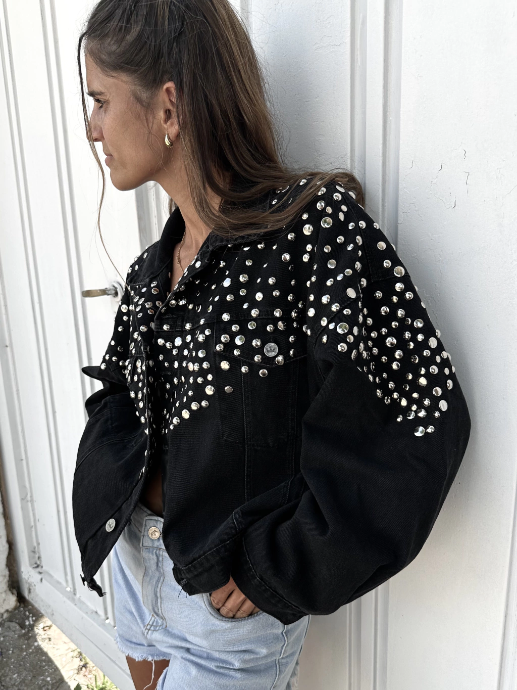 Campera de jean rígido oversize, intervenida manualmente con tachas remachadas.