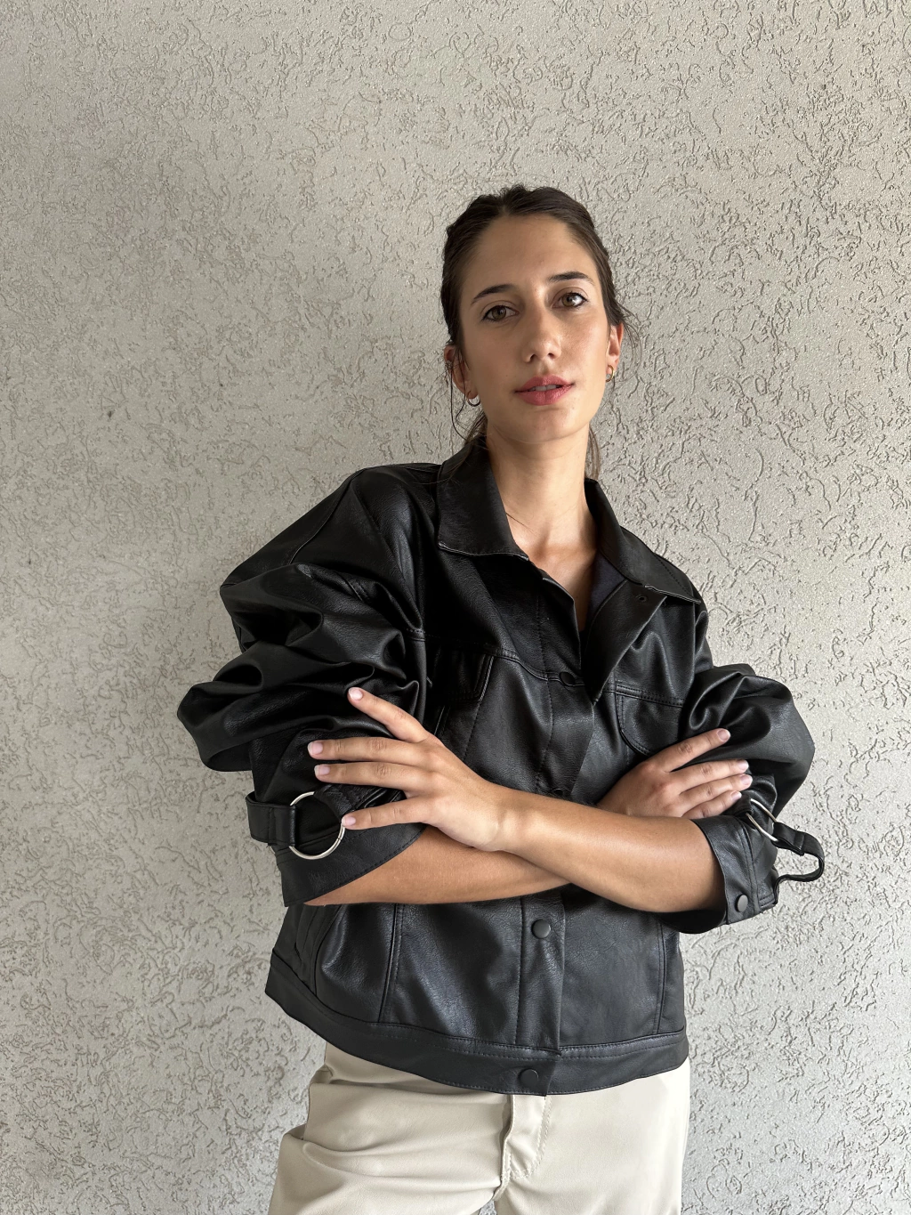 Esta campera oversize está confeccionada en ecocuero de calidad premium, ofreciendo un look moderno y sofisticado. Las argollas en su diseño aportan un detalle único y atractivo. Su corte amplio proporciona comodidad, permitiendo una gran versatilidad para combinar con diferentes estilos.