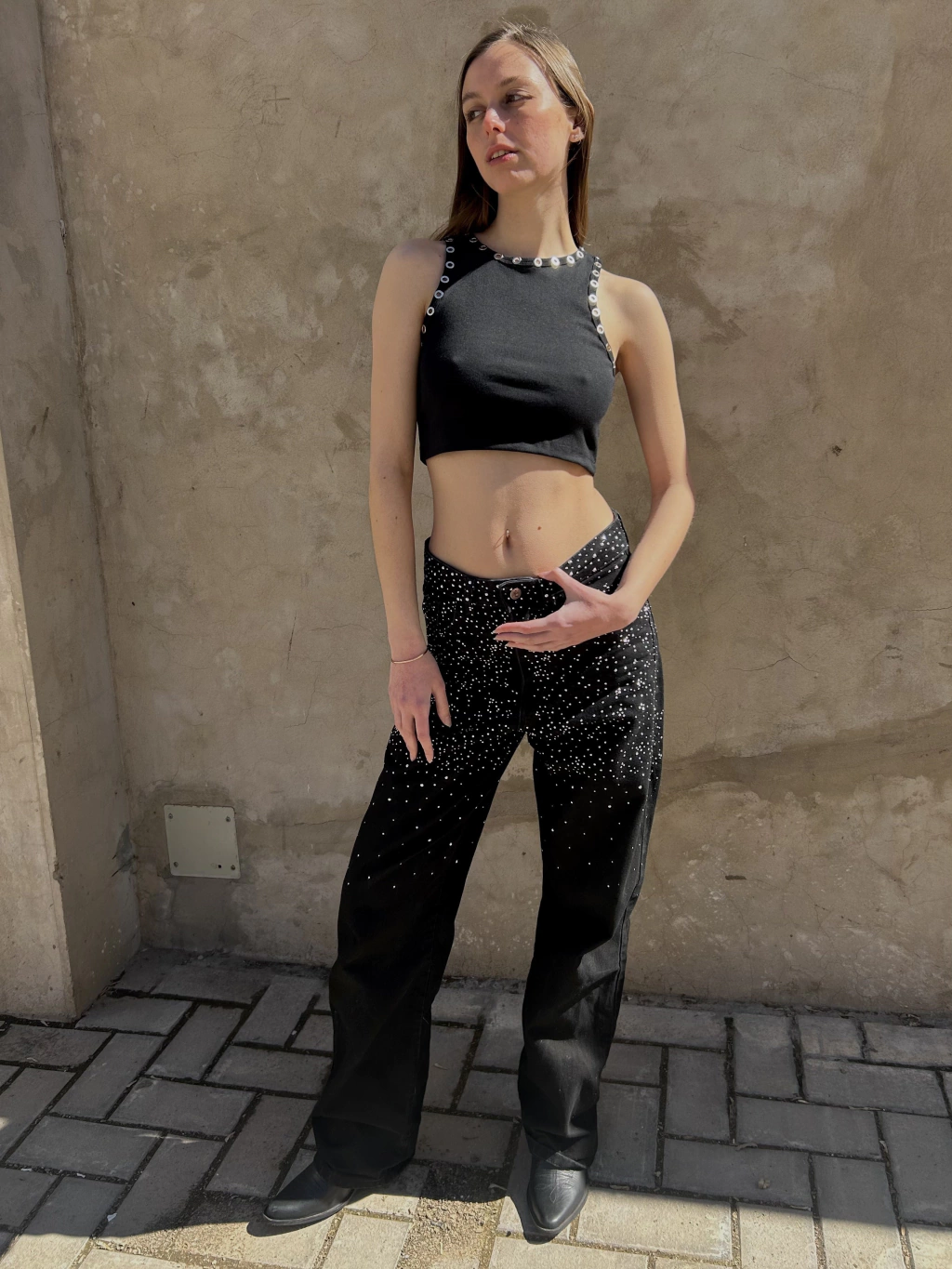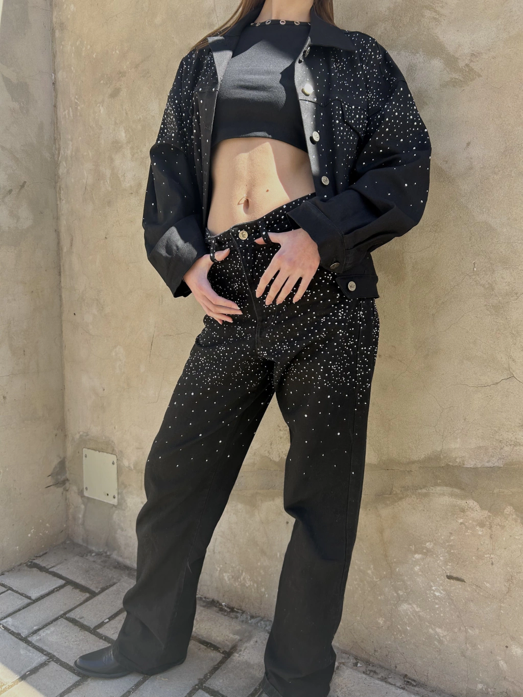 Pantalón Wide Leg Eclipse Negro Confeccionado en jean azul rígido, este pantalón wide leg es la elección ideal para un look moderno y cómodo. Su diseño se destaca por los strass que adornan la prenda, añadiendo un toque de elegancia. Perfecto para combinar con tus remeras favoritas o blusas elegantes.
