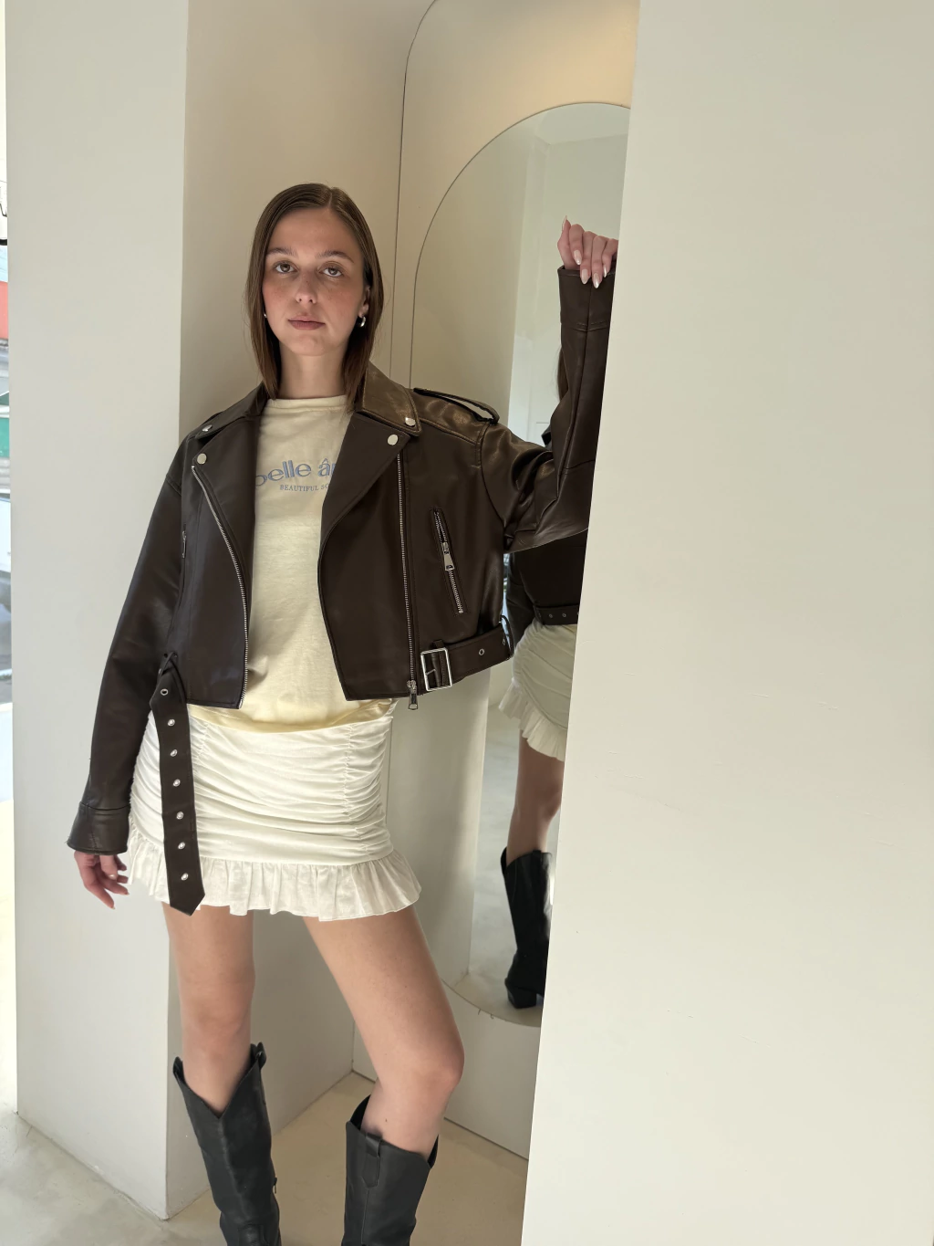Pollera confeccionada en lino de alta calidad, toda forrada por dentro, ideal para quienes buscan comodidad y elegancia. Presenta un frunce en el delantero que realza la silueta y un volado en la parte inferior que aporta movimiento y frescura. Cuenta con un cierre de acceso práctico y discreto. Perfecta para combinar en cualquier ocasión, esta pollera es una pieza versátil y sofisticada.
