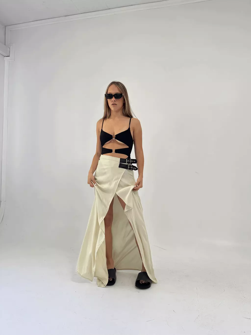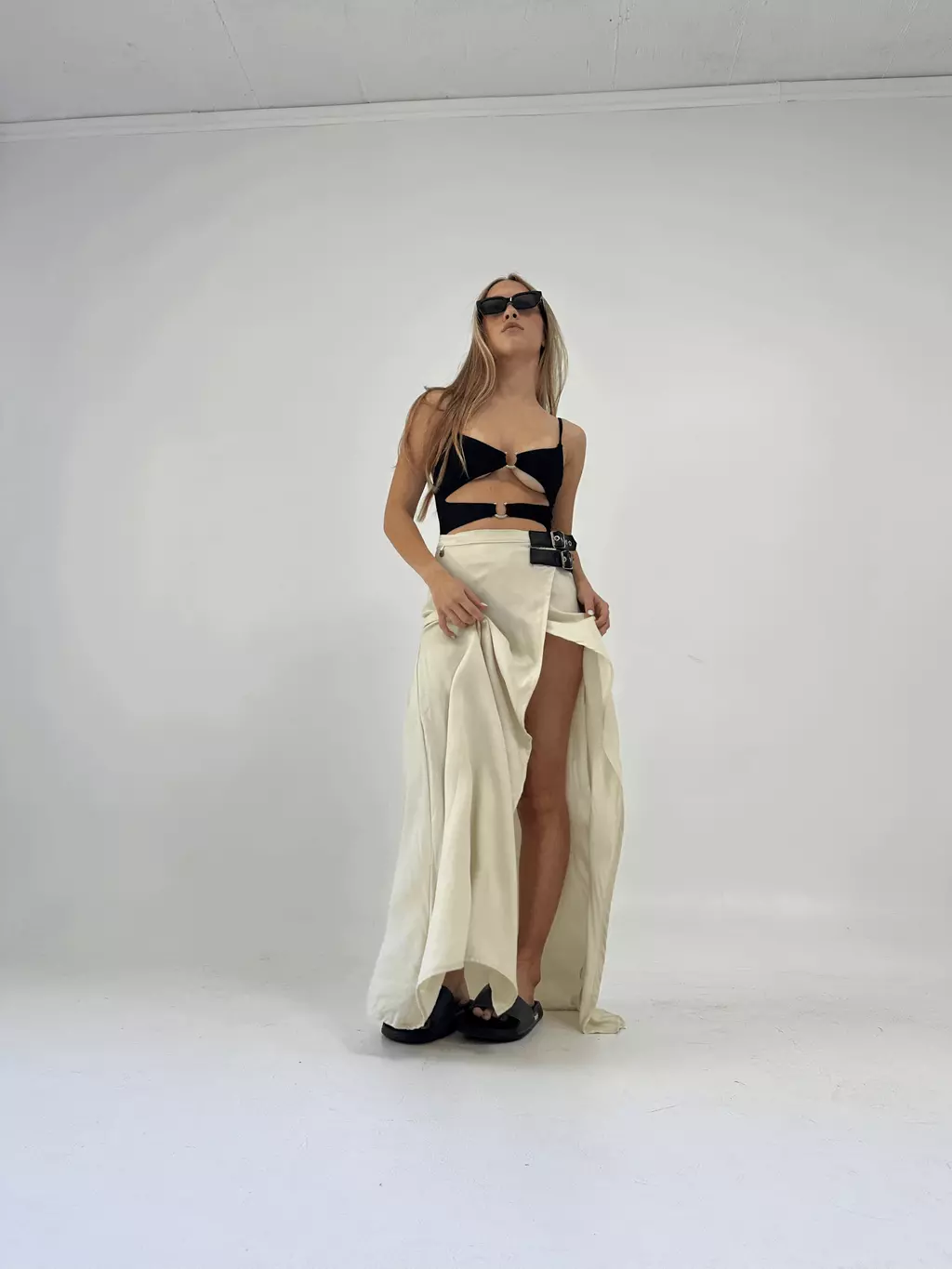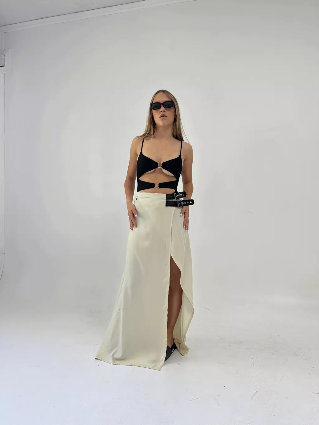 Esta pollera larga de tela liviana, es ideal para quienes buscan comodidad y estilo. Su diseño cruzado, estilo pareo, permite que una de las piernas quede descubierta, añadiendo un toque de elegancia con un tajo atractivo. Los detalles de hebillas de cuero en uno de los costados aportan un aspecto moderno y distintivo, además de permitir que se regule mejor a tu cintura.