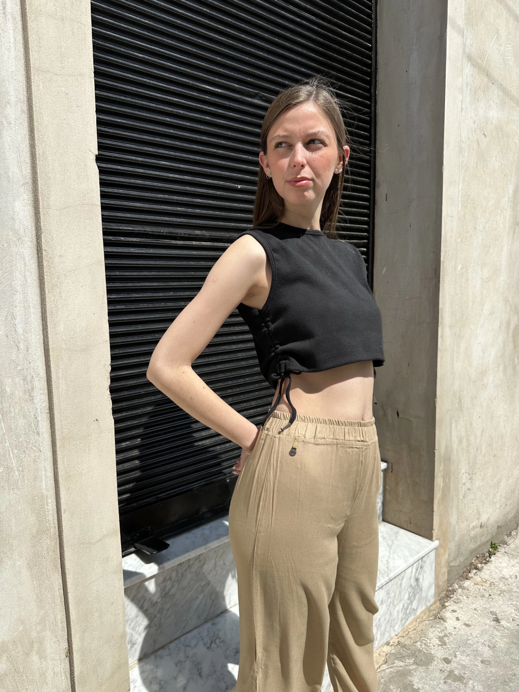 Top Malaui negro confeccionado en algodón ribb, ideal para un look cómodo y moderno. Este top presenta frunces a los costados que aportan un toque femenino y elegante, mientras que los terminales metálicos añaden un detalle distintivo.